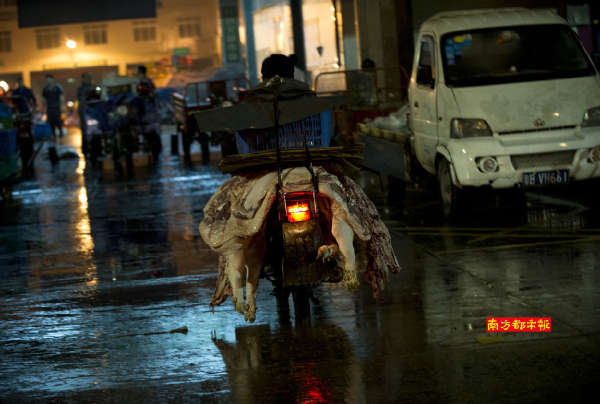 每天凌晨?jī)牲c(diǎn)到五點(diǎn)間,在公明的大街小巷里隨處可以看到綁著豬頭的摩托車或者是三輪車從身邊駛過(guò),然后消失在茫茫的黑夜中