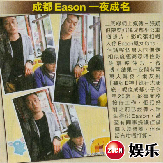 陳奕迅成都翻版陳奕迅網(wǎng)絡(luò)爆紅 據(jù)香港媒體報(bào)道,陳奕迅即將到內(nèi)地舉行巡回個(gè)唱,日前他率先到北京一大學(xué)出席代言及迷你音樂(lè)會(huì),吸引到大批學(xué)生到場(chǎng)支持。據(jù)聞,活動(dòng)門票還被黃牛黨炒到300人民幣一張。陳奕迅在會(huì)上除了勁歌熱舞外,還在臺(tái)上整蠱作怪,但會(huì)后有記者問(wèn)最近在臺(tái)灣媒體評(píng)選的十大爛片中,有三部他主演而獲選為爛片王,陳奕迅就乘機(jī)伸冤說(shuō)《東成西就2011》其實(shí)票房不算差,都收了幾千萬(wàn),只是 上周在網(wǎng)上瘋傳三張疑似陳奕迅在成都坐公交車的照片,拍這三張照片的人是陳奕迅的女粉絲,她說(shuō)因?yàn)檫@個(gè)男人和偶像相似度極高所以忍不住拍了下來(lái)放到了微博,結(jié)果一夜間有兩萬(wàn)人轉(zhuǎn)發(fā)。網(wǎng)友對(duì)“翻版E神”進(jìn)行了大起底,這位成都小子今年20歲,從事商務(wù)接待工作,他說(shuō)好久之前已經(jīng)被人說(shuō)長(zhǎng)得像E神,甚至有同事建議他加入娛樂(lè)圈,但他說(shuō)他沒(méi)有這樣的打算。 |