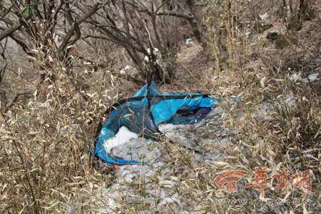 昨日,驢友“編外乞丐”致電本報(bào)說(shuō),他在終南山頂南北分界線(即黃河長(zhǎng)江分水嶺標(biāo)志)以東200米處一小樹林中,發(fā)現(xiàn)一個(gè)被雪壓塌的藍(lán)色帳篷,里面是一具男性驢友遺體。據(jù)初步判斷,死者死亡時(shí)間在半年以上。