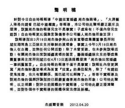 臺(tái)灣媒體報(bào)道,《自由時(shí)報(bào)》4月20日?qǐng)?bào)導(dǎo)中國(guó)山西煤大王邢利斌嫁女,周杰倫跑場(chǎng),影射他“向錢(qián)看、巴結(jié)中國(guó)權(quán)貴”。周杰倫所屬的杰威爾公司發(fā)出聲明稿澄清“完全不是事實(shí)”,也強(qiáng)調(diào)當(dāng)天周杰倫在臺(tái)灣。