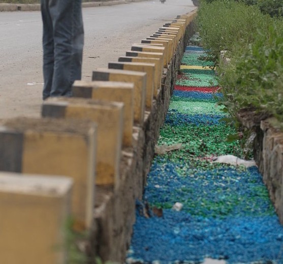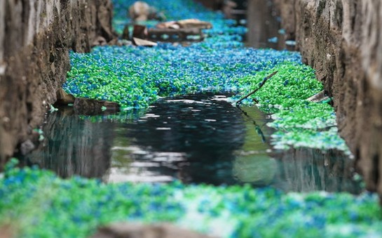 ????大量各色空心膠囊被倒進(jìn)明渠,幾乎看不到渠水。沿水流方向往東走,一些膠囊已隨水流而下,渠水被染成藍(lán)綠色,水中隨處可見(jiàn)已被泡大發(fā)脹的空心膠囊,綿延300余米。