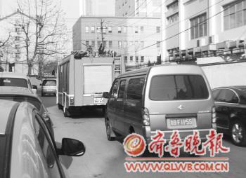 在秀湛二路上,因?yàn)槁穬膳酝M車,消防車無(wú)法到達(dá)失火地點(diǎn)。