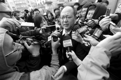 謝亞龍的律師走出法庭后被記者團(tuán)團(tuán)圍住。