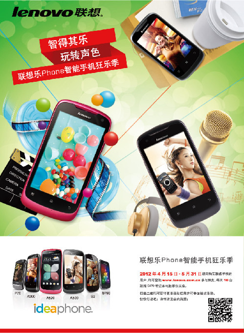 ????與此同時,聯(lián)想手機(jī)首屆“Music Doer音樂達(dá)人”大賽盛大起航,全面引爆“智得其樂 玩轉(zhuǎn)聲色”聯(lián)想樂Phone智能手機(jī)狂樂季。現(xiàn)在拿起手機(jī),掃描“聯(lián)想樂Phone智能手機(jī)狂樂季”二維碼,獲得更多活動信息,并可參加抽獎活動(詳情請見店內(nèi)海報)。