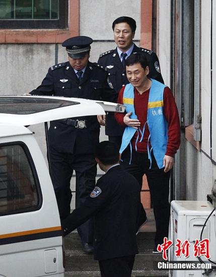 4月25日,中國(guó)足壇反賭掃黑系列案重頭戲之一的南勇案在遼寧省鐵嶺市中級(jí)人民法院開(kāi)庭審理,經(jīng)過(guò)一天的審訊,下午18點(diǎn)10分左右,中國(guó)足球運(yùn)動(dòng)管理中心原主任、中國(guó)足協(xié)原副主席南勇被押送回警車。從法庭到警車的路上,南勇始終面帶微笑,還不時(shí)回頭與警察交談。(劉關(guān)關(guān) 攝)