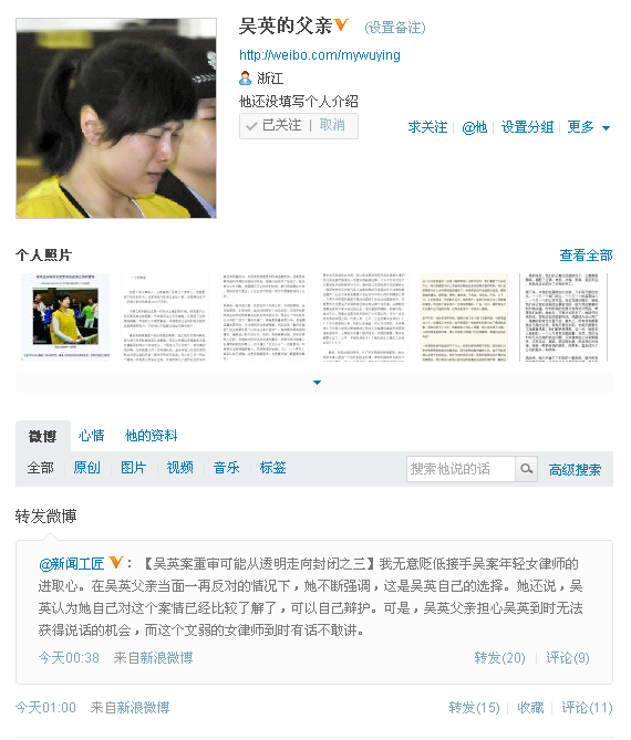 ????微博認證為媒體人萬茵的用戶發(fā)布三條微博,稱吳英案重審可能從透明走向封閉。他還在微博中指出,該律師取得律師資格時間不長,沒有刑辯經(jīng)驗。并且其發(fā)現(xiàn)這名律師分不清吳英案中的檢舉行為是自首還是立功。面對吳英父親的反對,該律師不斷強調(diào),這是吳英自己的選擇。她還說,吳英認為她自己對這個案情已經(jīng)比較了解了,可以自己辯護。但“吳英父親擔心吳英到時無法獲得說話的機會,而這個文弱的女律師到時有話不敢講”。微博分析稱,法院反干預的首要措施就是控制信息公開,安排一個可控的律師至關重要。截止記者發(fā)稿時,認證用戶名為楊照東的微博并未就此事表態(tài)。