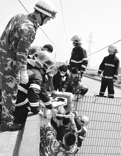 圖為消防隊員正在救援被高壓電擊傷的工人。(通訊員 田景超 張鵬 攝) 昨日上午,漢口一男子在房頂維修線路時,不慎被距房頂約2米多高的高壓線擊中,頓時全身起火,嚴重燒傷。 昨日上午10時13分,武漢市119指揮中心接到報警,稱一男子在江岸區(qū)中環(huán)物流被高壓電擊倒被困房頂,急需救援。接警后,指揮中心立即命令特勤消防一中隊3輛消防車及15名官兵前往營救。 10時18分 由于高壓線距離房頂比較近,供電公司工作人員將電斷后,消防官兵將救援器材及救援擔架拿到房頂,為防受傷男子被太陽曬,消防官兵將床單蓋在受傷男子身上,然后將其抬到一樓地面。 據(jù)其工友稱,事發(fā)后受傷男子身上衣服全部著火,工友找來滅火器朝他身上噴才將火撲滅,而他衣服幾乎被燒光。由于燒傷的劇烈陣痛,傷者一度想到自殺,在工友的勸說下才穩(wěn)定住了情緒。 隨后受傷男子被120救護車送往醫(yī)院救治。據(jù)了解,高壓線為11萬伏,目前男子被電擊原因還在調(diào)查中。(通訊員 田景超 張鵬) |
