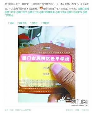 發(fā)在微博上的???。 ????“上學未戴紅領(lǐng)巾需罰5元一天”,昨日上午10點22分,網(wǎng)友“柒-----月”在微博上說,這是思明區(qū)世平小學的規(guī)定,其外甥已經(jīng)被罰4次,昨天是第5次。 ????記者發(fā)現(xiàn),該網(wǎng)友將內(nèi)容轉(zhuǎn)發(fā)給廈門多家媒體,同時上傳了“廈門市思明區(qū)世平學?!钡男??,但是卡上的姓名以及班級等內(nèi)容被遮擋,這條微博上也沒有明確指出是學校哪個年段班級以及哪位老師所為。 ????昨日中午,記 ????昨日下午2點左右,記者在思明區(qū)蓮花五村龍山南路找到了這所學校。記者了解到,這是一所民辦學校,除了小學,還有中學,學生人數(shù)將近2000。 ????此時,學校還未上課。記者在校門口詢問了幾位2年級、5年級的學生,這些學生均表示沒有聽說這件事。“不戴紅領(lǐng)巾要被扣分,但是不會罰錢?!币幻?年級的女同學這樣告訴記者。 ????這種事情會不會發(fā)生在個別班級呢?記者隨即找到了“世平學校”的楊校長。 ????在辦公室里,楊校長說:“我們一直都在和老師強調(diào),任何涉及收費的事情,都要向?qū)W校匯報,更不要說是罰款了”。 ????該校的董事長黃先生同意立即對所有戴紅領(lǐng)巾的班級進行查詢,包括2年級到6年級的總共18個班級。黃先生指派趙老師陪同,記者對這些班級的班長進行了簡短詢問,18名班長都明確表示,他們班上沒有發(fā)生過這種事。 ????校方推測,也有可能存在兩種情況:一種是某個班級老師說氣話,拿“罰款”來嚇唬嚇唬孩子,另一種則是這個孩子撒謊,為了向家長索要零花錢,謊稱老師要罰款。目前,這兩種說法都沒有得到證實。 ????就在記者和校方基本上排除發(fā)生此事的可能性后,網(wǎng)友“柒-----月”又在昨日傍晚發(fā)了后續(xù)微博,指明是該學校劉姓女教師所為,“經(jīng)確定,本人外甥已交兩元,其余欠賬!求曝光!” ????記者又將該信息反饋給“世平學校”的黃董事長,對方表示會對此事做進一步調(diào)查。本報也將繼續(xù)關(guān)注此事。(記者 汪長福) |