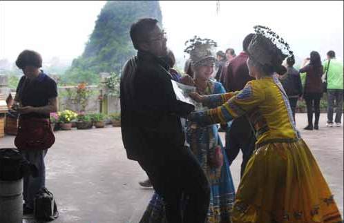 2012年4月23日,廣西桂林銀子巖旅游景區(qū)門口,穿著民族服裝的女子強(qiáng)行拉男游客拍照。 2012年4月23日,廣西桂林銀子巖旅游景區(qū)門口,穿著民族服裝的女子強(qiáng)行拉男游客拍照。 2012年4月23日,廣西桂林銀子巖旅游景區(qū)門口,穿著民族服裝的女子強(qiáng)行拉男游客拍照。 2012年4月23日,廣西桂林,銀子巖旅游景區(qū)門口,每天有一群穿著民族服裝的女子在門前強(qiáng)行拉男游客與自己拍照。有些男游客糾纏不過(guò)而只好答應(yīng)拍照,兩名穿民族服裝女子便分別挽著男游客的左右胳膊,另兩名穿民族服裝女子也馬上蹲在男游客前一起拍照。拍完照后,四名女子要求男游客各給10元“合影費(fèi)”。如男游客不答應(yīng)拍照,女子便破口大罵。 網(wǎng)友“洋朋友”在百度的桂林吧發(fā)貼說(shuō):“廣西銀子巖有女劫匪。我到銀子巖游玩,一到景點(diǎn)便有五個(gè)穿民族服裝的女人,抱著我的胳臂強(qiáng)行要我照相,并索要五十元,我不照,她們又踩又拉,我掙不脫,我說(shuō)沒(méi)錢我不照,她們就強(qiáng)行掏兜。” |