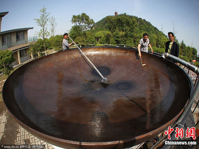 ???? 4月28日,江蘇南通狼山風景區(qū)園博園,工作人員當天為直徑3.5米的碳素鋼材質“世界第一鍋”進行了放水、點火和上油,做好了利用“天下第一鍋”煮江鮮的準備。