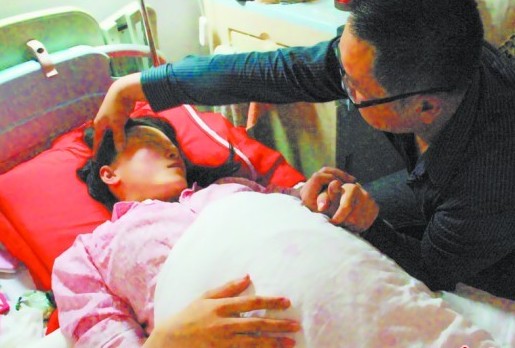 4月29日晚9時(shí)許,原巖濤駕車從開發(fā)區(qū)趕往青醫(yī)附院。 晚9時(shí)50分,原巖濤給妻子按摩頭部緩解頭痛。 妻子被診斷患上白血病,還懷上了雙胞胎,丈夫竭盡一切想保住妻子生命,而妻子卻堅(jiān)決要把孩子生下來……3月4日,本報(bào)對(duì)開發(fā)區(qū)白血病雙胞胎準(zhǔn)媽媽楊曉艷的故事進(jìn)行報(bào)道后,引起廣大讀者的關(guān)注。4月29日晚,在病痛折磨中懷胎八個(gè)月的楊曉艷在青醫(yī)附院剖腹產(chǎn)下一對(duì)雙胞胎女兒。 “4月27日住進(jìn)青醫(yī)附院本部待產(chǎn),岳母在那兒陪著,剛才突然打電話說我對(duì)象羊水破了?!?月29日晚8時(shí)30分許,楊曉艷的丈夫原巖濤正在開發(fā)區(qū)一家酒店承辦一家企業(yè)的晚會(huì),突然接到岳母打來的電話。羊水破裂意味著可能要馬上進(jìn)行剖腹產(chǎn)手術(shù),一下子緊張起來的原巖濤沒有忘記給一直關(guān)注他們的本報(bào)記者打來電話。 記者隨原巖濤趕到醫(yī)院產(chǎn)科病房時(shí),楊曉艷正安靜地躺在床上,患白血病后懷胎八個(gè)月,她沒有作任何藥物治療,但從未放棄跟病魔抗?fàn)?,就是為了等待孩子出生這一刻?!笆烨案忻傲?,也沒敢吃藥,現(xiàn)在有點(diǎn)頭疼?!睏顣云G話音剛落,原巖濤立刻上前給她揉起太陽穴。 “時(shí)間到了,現(xiàn)在要進(jìn)手術(shù)室準(zhǔn)備剖腹產(chǎn)?!贬t(yī)生打破了病房內(nèi)的寂靜,記者隨原巖濤一起看著楊曉艷被推往手術(shù)室?!皥?jiān)強(qiáng)點(diǎn),沒事。”去往手術(shù)室的路上,原巖濤一直握著妻子的手,進(jìn)入電梯后,楊曉艷對(duì)著記者的鏡頭擺出“勝利”的手勢。原巖濤后來告訴記者,自從2010年11月被確診患上白血病以后,妻子曾無數(shù)次對(duì)自己做這個(gè)手勢?!八幌胱屛译y過,只好自己表現(xiàn)得樂觀堅(jiān)強(qiáng)?!痹瓗r濤說。 晚上10時(shí)許,楊曉艷被推入手術(shù)室,被擋在手術(shù)室門外的原巖濤,開始了揪心的等待?!拔也痪o張,我感覺一切都會(huì)很順利!”眉頭緊鎖的他笑著對(duì)記者說。說完,他又抬起胳膊看表,每當(dāng)手術(shù)室內(nèi)有動(dòng)靜,他都會(huì)立刻把耳朵貼在門上傾聽。等待的空隙,原巖濤告訴記者,自己還沒給將要出生的孩子起名。 晚上10時(shí)56分許,從手術(shù)室內(nèi)隱約傳來一陣嬰兒啼哭聲,坐在椅子上的原巖濤一下子起身跑到手術(shù)室門邊,把耳朵貼在門上聽了聽后轉(zhuǎn)過頭問記者:“是不是生出來了?”“楊曉艷家屬在嗎?生了一對(duì)女兒,大人孩子都平安?!?1時(shí)8分許,兩名醫(yī)護(hù)人員各抱著一個(gè)嬰兒走出手術(shù)室,原巖濤立刻跑了上去。由于嬰兒早產(chǎn),需要立即送入位于新生兒科病房的保溫箱觀察,原巖濤跟著大夫來到病房外,被告知嬰兒在保溫箱中觀察期間不能探視后,原巖濤趕緊在病房門口仔細(xì)看了兩個(gè)孩子一眼,然后讓記者給他和女兒拍照留念。 正當(dāng)原巖濤給剛出生的女兒辦理入院手續(xù)時(shí),楊曉艷也被推回產(chǎn)科病房?!坝H愛的,咱們有孩子了,兩個(gè)女兒?!甭犝煞蛘f完,楊曉艷痛苦的表情中有了一絲笑意。 為了腹中寶寶,她毅然停藥 堅(jiān)強(qiáng)母親感動(dòng)市民,各界捐款已達(dá)20余萬 記者通過產(chǎn)科醫(yī)護(hù)人員獲悉,原巖濤和楊曉艷的長女出生于29日晚10時(shí)56分,重2130克;次女出生于10時(shí)57分,重2280克?!艾F(xiàn)在來看情況正常,但因?yàn)槟赣H患病,孩子又早產(chǎn),必須密切觀察治療。”此前,醫(yī)生曾介紹,一般來說白血病不會(huì)遺傳。 在生產(chǎn)前,由于體內(nèi)白細(xì)胞增多致脾大,醫(yī)生為防止楊曉艷在生產(chǎn)過程中脾臟破裂而準(zhǔn)備了備用血,幸運(yùn)的是手術(shù)過程很順利?!斑@幾天感冒咳嗽,生了孩子后全都好了。”30日上午,原巖濤高興地告訴記者,妻子順利生下雙胞胎女兒,真是一個(gè)“奇跡”。 “如果堅(jiān)持要生,大人和孩子可能都危險(xiǎn)?!睏顣云G懷孕后的白血病治療過程中,為以防萬一,大夫不得不將風(fēng)險(xiǎn)放大,然而面對(duì)大夫的屢次提醒,楊曉艷從未動(dòng)搖過自己的決心:“只要把孩子順利生下來,我怎么樣無所謂了?!?/p> 楊曉艷的母愛,讓醫(yī)生無奈,也讓人為之感動(dòng)?!拔液秃⒆佣己茫@是我想不到的結(jié)果?!?0日下午記者發(fā)稿前,慢慢從術(shù)后病痛中恢復(fù)的楊曉艷說,希望通過本報(bào)感謝關(guān)心他們的所有好心人?!吧铝撕⒆泳驮僖矝]有遺憾了,但我必須好好活著,我們家現(xiàn)在有孩子了……”說著說著,楊曉艷哽咽了起來。 “意外懷孕后,我也想讓她聽從醫(yī)生的建議,先終止妊娠好好治療白血病?!?0日凌晨1時(shí)許,在醫(yī)院辦理完各種手續(xù)后,原巖濤終于輕松地長吁一口氣,他對(duì)記者說:“心里一塊石頭落地了,妻子也不用再受那么多罪了?!?/p> 原巖濤說,妻子懷孕之后,在胎兒不斷長大的同時(shí),體內(nèi)白細(xì)胞數(shù)量也在不停增加?!鞍准?xì)胞多了之后,體內(nèi)脾臟就變大。”據(jù)介紹,懷孕之前,楊曉艷可以通過藥物治療,控制血液中的白細(xì)胞數(shù)量,然而2011年9月初得知懷孕后,她把一切藥物都收了起來。 “問醫(yī)生才知道,不吃藥的話還可以用物理療法,但非常痛苦?!痹瓗r濤說的物理療法,是指白細(xì)胞單采術(shù),2012年1月份,楊曉艷在青醫(yī)附院黃島分院