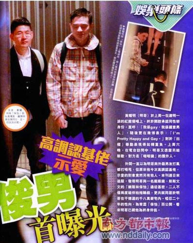 原來明哥的新歡是比他年輕 17年,斯文四眼外貌似林保怡的 33歲國產(chǎn)嫩男,名叫吳海剛,二人暗交一年,日前兩人被發(fā)現(xiàn)拍拖到戲院睇“露械”三級西片《色辱》兼撐枱腳食飯,而明哥的新歡吳海剛大有來頭, 07年來港工作,現(xiàn)任陽光衛(wèi)視旗下電子雜志《陽光時(shí)務(wù)》的副主編,筆名“柴子文”,曾任《南方周末》、《亞洲周刊》的編輯。