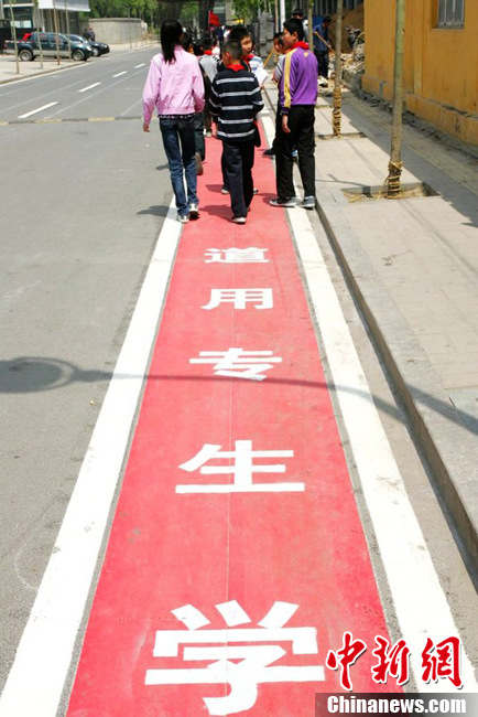 2012年5月2日,山東省濰坊市勝利東小學(xué)的學(xué)生放學(xué)走在“學(xué)生專用通道”上。為保障學(xué)生出行安全,日前,山東省濰坊市交警部門在這所學(xué)校門前設(shè)置了一條長約100多米的彩色“學(xué)生專用通道”,各類車輛都不得占用該通道,阻礙學(xué)生上下學(xué)通行,以保證學(xué)生出行安全。