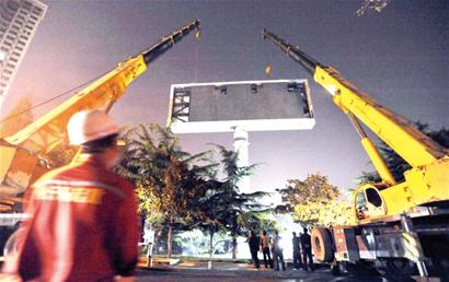 昨天深夜11時(shí),青島市城管執(zhí)法局指揮兩輛26噸重型吊車,開始拆除五四廣場(chǎng)綠地內(nèi)一個(gè)高27米、總重67噸的高炮廣告牌。據(jù)介紹,這個(gè)造價(jià)1000多萬元的高炮廣告牌是國(guó)內(nèi)唯一一個(gè)能360度旋轉(zhuǎn)的單立柱高炮廣告牌。 據(jù)介紹,這個(gè)高炮廣告牌位于五四廣場(chǎng)綠地西側(cè)。根據(jù)我市戶外廣告相關(guān)條例,市內(nèi)四區(qū)禁止設(shè)置單立柱廣告,該廣告牌已經(jīng)不符合新規(guī)要求,到期予以拆除。據(jù)介紹,該廣告牌高27米,柱體重約27噸,LED顯示屏重40噸。城管部門調(diào)集兩輛重型吊車對(duì)其實(shí)施拆除。預(yù)計(jì)拆除施工將持續(xù)到3日凌晨4時(shí)左右。(記者 趙健鵬 通訊員 張君 攝) |