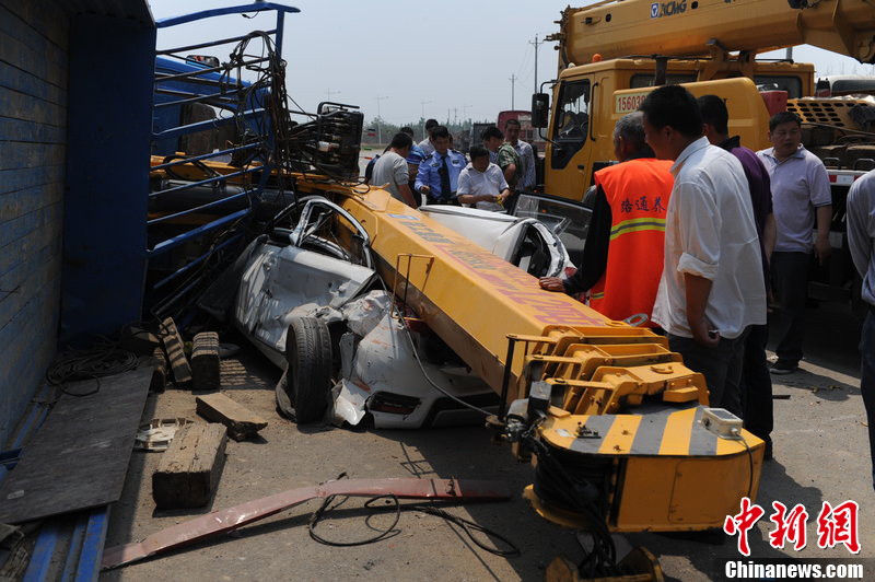2012年5月2日,鄭州,車禍現(xiàn)場。小車被一吊車側(cè)翻的吊臂壓扁。當(dāng)日上午10時許,河南省鄭州市航海路與新修通往機(jī)場的四港聯(lián)動大道交叉口往南5公里左右,一輛行駛的吊臂上標(biāo)有12噸字樣的吊車,在一十字路口側(cè)翻,砸在一輛正在行駛的小轎車上,小轎車車廂幾乎全被壓扁,所幸的是車上坐的夫妻和兩歲多的孩子一家三口除駕駛員頭部輕微刮傷全都安然無恙。海鷹攝
