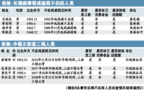 吃空餉的行為將得到清理。 ????昨日,浙江省永康市的市委機(jī)關(guān)報(bào)《永康日報(bào)》引起了公眾前所未有的關(guān)注。該報(bào)用了整整兩個大版,刊登了《永康市在編不在崗人員自查情況結(jié)果通報(bào)》,曝光、公示了該市192名因各種原因“在編不在崗”的機(jī)關(guān)事業(yè)單位工作人員。 ????何謂“在編不在崗”?通俗地說,就是“占著茅坑不拉屎”,其中甚至不乏領(lǐng)著工資不出工的惡劣情形——即“吃空餉”。這種現(xiàn)象絕不僅僅存在于永康,且多年來屢禁不止。永康這回動了真格,準(zhǔn)備用“自查——公示——舉報(bào)、核查——再公示……”的循環(huán)來打破各條黑色和灰色的頑固利益鏈。 ????若非永康市委自曝家丑,外人恐怕很難相信竟然有這么多的“公家人”吃了這么多年的“白飯”。這些“白飯”,都是納稅人的血汗錢。 ????請假請了23年 ????被判刑工資照領(lǐng) ????《永康市在編不在崗人員自查情況結(jié)果通報(bào)》(注:以下簡稱“《通報(bào)》”)的大背景是永康所屬的金華市正在展開一場“效能革命”,而“在編不在崗”無疑是最損害機(jī)關(guān)事業(yè)單位效能的情形之一。被這份《通報(bào)》曝光的機(jī)關(guān)事業(yè)單位工作人員共計(jì)192人,永康市委把他們分成了8大類。 ????涉及人數(shù)最多的,是長期病事假或超假不歸的人員,共69人。這69人中,有57人至今仍領(lǐng)著工資,但具體情況五花八門。 ????有位姓胡的初中教師,今年50歲,1989年11月,27歲的他因病請假,這個假一請就是23年。根據(jù)自查結(jié)果,多年來財(cái)政一直給胡老師撥款發(fā)工資,他也一直領(lǐng)著工資。根據(jù)《通報(bào)》披露的情況,包括胡老師在內(nèi),請假時間在20年以上的共有3人;請假時間10年~20年的,共有8人。 ????第二類,是停薪留職人員,共46人。第三類,是借用、借調(diào)、抽調(diào)人員,共23人。第四類,是“上班不夠正常”的中層正職退二線人員,共9人,均來自行政執(zhí)法局。 ????第五類是刑事處罰的人員,共7人。7人中有兩人被判處緩刑,財(cái)政仍在撥款,兩人仍領(lǐng)著工資;此外還有兩人領(lǐng)取生活費(fèi)。第六類,是在家待崗人員,共8人。 ????第七類,是未辦理辭職擅自離崗人員,共10人。其中有位姓胡的教研室原工作人員,2006年3月便已離開單位,但直至今年的4月份,財(cái)政仍撥款發(fā)放他的工資,工資未被領(lǐng)走,由核算中心暫存本單位賬戶。另有位姓胡的女士,2010年9月從職技校擅自離開,此后財(cái)政未再撥款,但她直到今年的1月份才被學(xué)校停發(fā)工資。 ????第八類,是“其他情形不在崗的人員”,共20人。 ????教育系統(tǒng)是“在編不在崗”的重災(zāi)區(qū),共有88人上了《通報(bào)》。永康市紀(jì)委書記藍(lán)群英對此頗為不滿:“據(jù)我所知,永康教育系統(tǒng)臨時聘用的人數(shù)達(dá)到700多人,卻有這么多在編教師不上崗授課?!?/p> ????嚴(yán)打“拿錢不干事” ????謊報(bào)病事假要開除 ????在《通報(bào)》開頭,永康市委這樣介紹自查的深層次原因:“近幾年來,少數(shù)機(jī)關(guān)事業(yè)單位工作人員以各種理由或借口脫離工作崗位,拿錢不干事,占編不在崗,嚴(yán)重干擾和影響了機(jī)關(guān)事業(yè)單位正常的工作秩序?!?/p> ????永康市紀(jì)委效能辦公室向記者介紹,永康之所以開展對“在編不在崗”人員的檢查工作,也是基于民間的風(fēng)言風(fēng)語。 ????“日常工作中確實(shí)聽到有人說某些人‘不上班卻照領(lǐng)工資’以及‘正式工不上班,臨時工上班’,因此,我們打算做一次摸底。雖然以前也開展過類似的工作,但從未采用過公示這種公開的方式,也從未上升到市級重要工作的層面,結(jié)果都不徹底?!惫ぷ魅藛T坦言。 ????當(dāng)?shù)匾幻麢C(jī)關(guān)干部告訴記者:“有的人常年領(lǐng)著工資不上班,導(dǎo)致單位作風(fēng)渙散,遲到、早退領(lǐng)導(dǎo)不敢批評。領(lǐng)導(dǎo)一批評,就難保有人嘴硬:‘那誰誰誰連班都不上,我遲到一會兒算什么?’” ????永康市紀(jì)委書記藍(lán)群英向記者介紹,此次檢查涉及100多個部門,各單位自查后填寫表格上報(bào),然后在《永康日報(bào)》上公示。在地方黨報(bào)上公布舉報(bào)電話,一方面是希望進(jìn)一步收集已公示人員的信息,另一方面是希望有人舉報(bào)“漏網(wǎng)之魚”。 ????公示舉報(bào)期為一周,一周后根據(jù)舉報(bào)情況再核查,再公示,再處理,預(yù)計(jì)整項(xiàng)工作在6月底前結(jié)束?!坝行﹩挝灰詾槲覀儭哌^場’,所以存在瞞報(bào)、少報(bào)。但我們這次下決心要徹查,在這次公示之后,我們會根據(jù)舉報(bào)核查的情況再進(jìn)行新的公示,一遍遍地公示,才能徹查,才能盡可能地做到無瞞報(bào)、無漏報(bào)?!彼{(lán)群英說。 ????目前看來,這場行動的主要阻力仍是個別機(jī)關(guān)事業(yè)單位的隱瞞不報(bào)。藍(lán)群英對行動的前景很有信心,她認(rèn)為,只要充分公示,引入公眾監(jiān)督,就能斬草除根。該市效能辦則稱,已掌握各單位在編不在崗人員的情況,如有單位依舊瞞報(bào),單位領(lǐng)導(dǎo)及直接責(zé)任人要承擔(dān)責(zé)任;涉嫌犯罪的,甚至要移送司法機(jī)關(guān)追究法律責(zé)任。 ????對于請病假一請就是一二十年的怪現(xiàn)狀,藍(lán)群