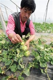 辛辛苦苦種出的甜瓜,一個(gè)個(gè)竟然長(zhǎng)得奇形怪狀,瓜農(nóng)的心真是傷透了。昨天上午,萊西市馬連莊鎮(zhèn)崔格莊和仲格莊兩村的數(shù)名村民向記者反映,共有7戶40多畝大棚甜瓜,使用了當(dāng)?shù)厣a(chǎn)的有機(jī)化肥后,甜瓜苗半死不活,有的長(zhǎng)出了怪狀,還裂了大口子。本來一個(gè)月的成熟期,如今兩個(gè)月了還不熟。瓜農(nóng)懷疑他們買到了假化肥。隨后,記者將情況反映給了萊西農(nóng)業(yè)局,相關(guān)負(fù)責(zé)人稱,他們將盡快成立專家組,近日趕往現(xiàn)場(chǎng)調(diào)查造成甜瓜變形的原因。 40多畝甜瓜幾近絕產(chǎn) 昨天,記者驅(qū)車一百多公里來到萊西市馬連莊鎮(zhèn)崔格莊村,瓜農(nóng)李利剛一臉愁容地告訴記者,今年春節(jié)過后,他種了兩個(gè)大棚共6畝多甜瓜,去年冬天花1000多元買了10多袋有機(jī)化肥并施用。等瓜苗出來后卻發(fā)現(xiàn)出現(xiàn)了卷葉等情況,開始他覺得是瓜種不好,就換了種子又重新育了一次苗,可是過了一個(gè)月,讓他擔(dān)心的問題還是發(fā)生了。 “本來這大棚甜瓜一個(gè)月就成熟上市了,可今年種的瓜到了成熟期就是不熟,許多瓜還長(zhǎng)不大,有的裂了口子,更嚇人的是有許多瓜竟然長(zhǎng)得奇形怪狀?!崩罾麆偢嬖V記者,他種了10多年甜瓜,還是頭一次遇到這種情況,同村和鄰村的7戶瓜農(nóng)的40多畝甜瓜都出現(xiàn)了這種情況,有一家3畝甜瓜竟沒開花結(jié)果。 “怪狀”甜瓜一直不熟 記者在李利剛等瓜農(nóng)的帶領(lǐng)下,來到了崔格莊村南側(cè)的一片甜瓜棚里,表面上看這些綠油油的甜瓜苗沒有什么異樣,但靠近仔細(xì)一看,瓜秧的葉子有許多都是翻卷著的,像是枯了但又沒有死。再看結(jié)出的甜瓜,有的像雞蛋大小,大一點(diǎn)的看上去不像是甜瓜,形狀長(zhǎng)成了多角形,有的瓜上冒出一個(gè)大疙瘩,有的出現(xiàn)了大裂口。 瓜農(nóng)王進(jìn)高說,這些瓜在一個(gè)月前就應(yīng)該收獲了,可到現(xiàn)在一直不成熟,就是個(gè)別的瓜熟了,但長(zhǎng)得奇形怪狀,拿到市場(chǎng)上也沒人要。記者在甜瓜大棚里轉(zhuǎn)了一圈發(fā)現(xiàn),7戶瓜農(nóng)的甜瓜基本是同一種情況。 假化肥造成甜瓜變形 李利剛告訴記者,他發(fā)現(xiàn)問題后,就懷疑在馬連莊鎮(zhèn)一家農(nóng)資站購(gòu)買的有機(jī)化肥存在問題。李利剛說,出現(xiàn)問題的7戶瓜農(nóng)用的是同一種化肥,這不能是巧合。為了證實(shí)化肥是否有問題,李利剛和幾名瓜農(nóng)做了實(shí)驗(yàn),將兩棵瓜苗種在不同地方,一棵用同一種有機(jī)肥,而另一棵一點(diǎn)不用,過了半個(gè)月后,用化肥的瓜苗和大棚里出現(xiàn)的情況一樣,而沒用化肥的那棵瓜苗生長(zhǎng)得很正常。 記者看到,瓜農(nóng)用的這種有機(jī)化肥是萊西開發(fā)區(qū)一家叫海利豐的化肥公司生產(chǎn)的海藻功能肥。據(jù)這種化肥的經(jīng)銷商稱,這種化肥是去年的新產(chǎn)品,去年冬天在馬連莊鎮(zhèn)一共才出售了1噸多,但不知道瓜出現(xiàn)的這種問題是否和化肥有關(guān)。 大棚瓜絕產(chǎn)一畝虧兩萬 “現(xiàn)在甜瓜剛上市,價(jià)格也很高,俺眼看著到手的錢不能賺?!弊蛱焐衔纾限r(nóng)李利剛告訴記者,他今年種了6畝多瓜,畝產(chǎn)5000斤,總共就是3萬斤,按市場(chǎng)價(jià)4元一斤,就是12萬元,人工費(fèi)不算,加上兩個(gè)大棚投入的10多萬元,這下真是賠大了。 在馬連莊鎮(zhèn)仲格莊和崔格莊兩個(gè)村,有40多畝大棚甜瓜用了同一種化肥,幾乎全部絕產(chǎn)了。當(dāng)?shù)卣私獾角闆r后,專門派人幫助瓜農(nóng)協(xié)調(diào)解決。 “事情見報(bào)廠家不管了” 據(jù)了解,出現(xiàn)問題后,7戶瓜農(nóng)多次來到位于萊西市區(qū)的化肥廠討說法,化肥廠相關(guān)工作人員稱他們的化肥在質(zhì)量上不存在問題。昨天上午,廠方派出專人來到馬連莊鎮(zhèn),在瓜棚里實(shí)地進(jìn)行調(diào)查后答復(fù)說,等過幾天后再給結(jié)果。 昨天上午,記者來到仲格莊村采訪時(shí),正好遇上萊西海利豐化肥企業(yè)的相關(guān)技術(shù)人員在瓜棚里進(jìn)行調(diào)查,當(dāng)聽到記者要來采訪并打算報(bào)道時(shí),廠方一名工作人員急眼了,他對(duì)幾名瓜農(nóng)說:“如果讓記者報(bào)道,你們這事我們就不用協(xié)商解決了,干脆走司法渠道解決吧?!瘪R連莊鎮(zhèn)農(nóng)資站相關(guān)負(fù)責(zé)人告訴記者,因?yàn)檫@種化肥是新產(chǎn)品,購(gòu)買的不是很多,他也在積極協(xié)調(diào)廠家,快點(diǎn)弄清事情真相,如果是化肥的問題,將盡快解決。 調(diào)查: 工商封存疑似“問題化肥” 昨天上午,記者將情況反映給了萊西市工商局,馬連莊工商所執(zhí)法人員立即趕到現(xiàn)場(chǎng),將瓜農(nóng)懷疑的數(shù)袋問題化肥封存,讓經(jīng)銷商暫停銷售,等農(nóng)業(yè)部門的鑒定結(jié)果出來后再作處理。工商執(zhí)法人員告訴記者,因?yàn)轳R連莊鎮(zhèn)是種植甜瓜有名的鎮(zhèn),他們接到投訴后也十分重視,但由于確定不了化肥到底是否真存在問題,所以只能對(duì)經(jīng)銷商作出相應(yīng)處理。瓜農(nóng)索賠問題,要等到農(nóng)業(yè)部門的鑒定出結(jié)果后才能立案調(diào)查。 進(jìn)展: 農(nóng)業(yè)局專家將調(diào)查真相 “我們將盡快組成專家,到瓜棚進(j