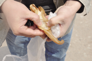 劉先生說(shuō)著將裝著豬耳朵的袋子打開(kāi),一股類似化肥的刺鼻味道沖了出來(lái),讓人作嘔?!拔覒岩蛇@是用明膠和塑料做成的,以前在電視上看過(guò)類似的報(bào)道?!庇浾吡私獾剑N售這種豬耳朵的攤販經(jīng)常是一個(gè)星期來(lái)一次,即使來(lái)了也是六七點(diǎn)鐘到,工商部門上班前離開(kāi)。