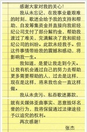 在聲明最后一段,張杰再次強(qiáng)調(diào)從未貪污,并保留向歪曲事實(shí)的媒體通過法律途徑予以追究的權(quán)利,“我從未貪污、私吞歌迷募款,就有關(guān)媒體歪曲事實(shí)、惡意毀壞名譽(yù)的行為,我將保留通過法律途徑予以追究的權(quán)利?!?/p>