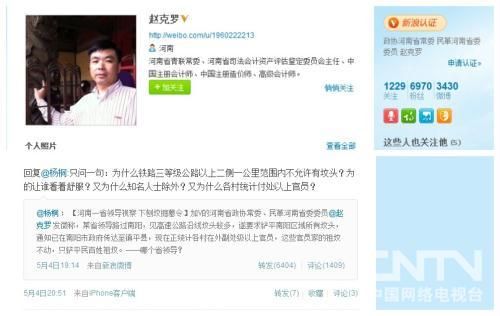 從5月3日發(fā)了第一篇微博開始,個(gè)人簡(jiǎn)介為河南政協(xié)常委、民革河南省委員的網(wǎng)友“趙克羅”關(guān)于南陽平墳的微博就沒有停過。他發(fā)的關(guān)于平墳微博廣為擴(kuò)散,網(wǎng)友楊桐的轉(zhuǎn)載更是被轉(zhuǎn)發(fā)6000多次。
