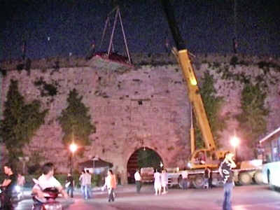 昨日晚十點左右,有南京市民反映在該市中華門城堡旁,一輛看起來很名貴的跑車被吊機吊上了南京市國家重點文保單位——中華門城堡上。隨即當?shù)孛襟w前往現(xiàn)場發(fā)現(xiàn),這竟然是一輛名貴的法拉利跑車。這輛跑車在吊上城堡以后,立刻就有一個試駕司機在城堡上的城墻地磚上試車。根據(jù)當?shù)孛襟w的現(xiàn)場視頻顯示,這輛豪車在司機的駕駛下,在僅有十來米寬的城墻上急速啟動,前進后退轉彎……轟鳴的馬達和刺耳的剎車聲,讓人擔心600年的古董墻磚碰到這高速運行的車輛肯定是要“灰飛煙滅”了,而急速轉彎和急剎車在城墻地磚上也留下了明顯的車輪痕跡。