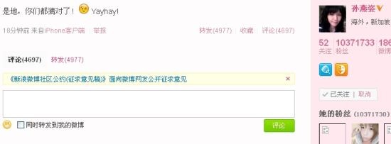 孫燕姿微博截屏 北京時(shí)間5月7日消息,近日有報(bào)道稱,孫燕姿在結(jié)婚滿一周年(5月8日)的前夕透露自己懷孕消息,并表示這是他們夫妻最好的結(jié)婚周年賀禮。對此,孫燕姿通過微博承認(rèn)了懷孕的喜訊:“是地,你們都猜對了!Yayhay!” 孫燕姿去年5月8日與拍拖五年的男友納迪姆在家鄉(xiāng)新加坡舉行婚禮,這個(gè)“508”新婚之日正是孫燕姿與老公交往5周年紀(jì)念日。穿上圓領(lǐng)簡約婚紗的孫燕姿與老公十指緊扣甜蜜出嫁,表示要為老公做一個(gè)賢惠的妻子。納迪姆曾在香港公司擔(dān)任市場行銷主管,2007年為孫燕姿將事業(yè)重心從香港轉(zhuǎn)移到新加坡,并在新加坡定居。現(xiàn)任職新加坡英杰華品牌與市場部的高級執(zhí)行員?,F(xiàn)有新加坡永久居留權(quán),熱愛運(yùn)動(dòng),曾參加公司“鐵人三項(xiàng)”競賽。 |