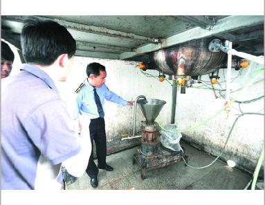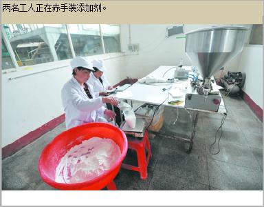 ![]() ??? 生產(chǎn) 女工用小鏟裝袋子 ????“這個環(huán)境太差勁了,這樣的條件肯定不達標。 ”剛走進生產(chǎn)車間,執(zhí)法人員便發(fā)出“感慨”,生產(chǎn)食品添加劑應(yīng)該是在密閉消毒過的室內(nèi),但這個車間不僅大門洞開,而且車間的窗戶全部打開來用于散熱,辦公區(qū)在生產(chǎn)車間里面,而生產(chǎn)用的設(shè)備也有不少的污垢,在包裝車間內(nèi),兩名女工赤手拿著小鏟子在給添加劑裝袋,而所謂的進門消毒間就是一個簡易洗手盆。負責(zé)人張先生則一個勁地表示,自己已經(jīng)停產(chǎn)很長時間了,“那你這些工人在干嘛,這不是在生產(chǎn)么。 ”執(zhí)法人員反問道,他頓時啞口無言。 ????