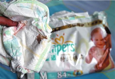新幫寶適紙尿褲上現(xiàn)紅色污跡。(實習記者 王德陽 攝)