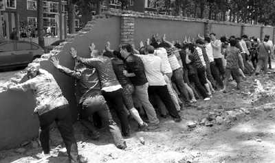 居民們合力將圍墻推倒。供圖/本報(bào)讀者曹女士 昨天上午,四五百名居民聚集在新街坊小區(qū)北側(cè)門外。居民們認(rèn)為,附近北苑賓館的200米圍墻占據(jù)了出行通道,造成出行不便引發(fā)不滿。雙方爭議多時(shí)未果,氣憤的居民合力將墻推倒。 昨日上午11點(diǎn),在出行通道北側(cè)北苑賓館工地前,200余米長的圍墻已被推倒,數(shù)十名民警正從現(xiàn)場陸續(xù)撤離。 “目前的出行通道,基本只能供單向行駛,進(jìn)出的車經(jīng)常面對面堵著”,有居民介紹,目前新街坊小區(qū)僅有兩個(gè)出口,西側(cè)出口道路一直未通,出行只能靠小區(qū)北側(cè)出口。近期,北苑賓館在翻蓋新樓時(shí),拆除了原有圍墻,在建新圍墻時(shí)南移了4米,占據(jù)了出行通道,造成小區(qū)出行道路嚴(yán)重受阻,上千戶居民經(jīng)常因?yàn)槎萝嚩绊懝ぷ骱蜕睢?/p> 居民介紹,4月底就曾因圍墻發(fā)生過一次爭議。本月4日,新街坊居委會(huì)組織協(xié)調(diào)會(huì),小區(qū)部分居民和北苑賓館施工方參加,但雙方協(xié)調(diào)無果。 “協(xié)調(diào)會(huì)拿了圖紙,但沒人看得懂”,居民們說,施工方未拿出有信服力的材料,來說明占用這部分道路面積的合法性。由于雙方爭執(zhí)不下,昨天上午10點(diǎn)左右,四五百名居民聚集在工地圍墻前,憤怒的居民將圍墻推倒。 昨天,北京城建集團(tuán)一負(fù)責(zé)人表示,重建范圍有圖紙和批文,肯定是合理合法的。其余事宜需向當(dāng)?shù)卣私?。昨日下午,記者多次?lián)系來廣營鄉(xiāng)政府宣傳部,對方始終未作出回應(yīng)。 |