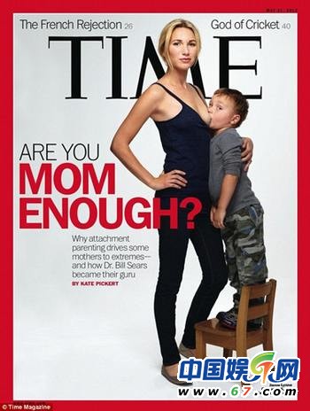在這溫馨的節(jié)日里,美國《時代》周刊特別策劃了母親節(jié)封面。圖為個母親站立為近4歲的兒子喂奶。喂奶照封面刊發(fā)后,卻引起了網(wǎng)友們的熱議,紛紛表示,喂奶照封面雖然創(chuàng)意新穎但尺度過大“越過了紅線”。據(jù)了解,喂奶照封面上的母親來自洛杉磯的杰米,26歲的杰米是兩個孩子的母親,現(xiàn)年5歲的大兒子塞繆爾是 2010年11月從埃塞俄比亞領(lǐng)養(yǎng)的,小兒子阿拉姆為親生兒子已經(jīng)快4歲。