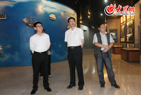 聊城市委常委、宣傳部長趙慶忠(中),大眾報業(yè)集團黨委常委、副總編輯郝克遠,大眾網(wǎng)總編輯朱德泉一同參觀中國運河文化博物館(盛堃 攝影)