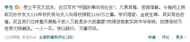 16日晚,華生在個人微博上就媒體報道的其“身價30億攜夫人鐵凝捐東南大學千萬”一事進行了回應。他在微博中感慨“學識落寂,金錢生輝,其實有些悲催”。他同時表示“我們這樣整天爬格子的人又能是多大的富豪”,但同時也認為,“捐資助教實我中華傳統(tǒng);回饋母校乃世界文明潮流。一人一瓦,學以踐行,萬事可成”。