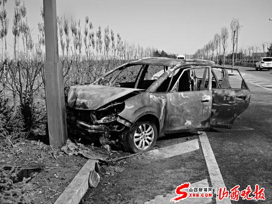 ????4月24日晚,大同市御河?xùn)|路寺兒村路段附近,在一輛熊熊燃燒的小轎車?yán)?,被周寶刀劈錘擊過的“那家伙”徹底葬身火海。