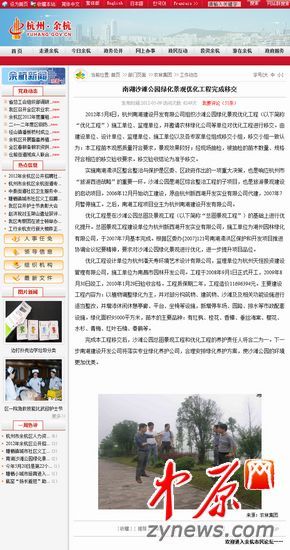 接到爆料,中原網(wǎng)記者打開了網(wǎng)址為 的頁(yè)面。這是一篇題為《南湖沙灘公園綠化景觀優(yōu)化工程完成移交》的新聞,發(fā)布時(shí)間為2012年5月9日,位于杭州市余杭區(qū)政府網(wǎng)站“部門頁(yè)面 >>農(nóng)林集團(tuán) >>工作動(dòng)態(tài)”欄目下。
