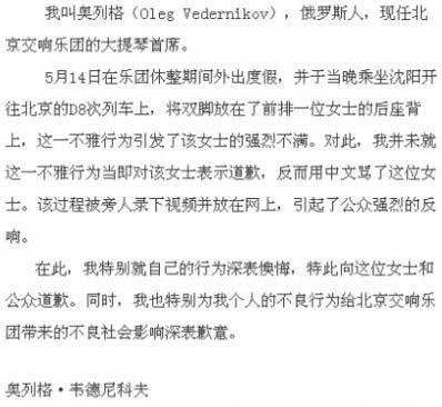 ????昨天下午5點(diǎn),記者趕到北京交響樂(lè)團(tuán)辦公大樓,樂(lè)團(tuán)工作人員首先向記者發(fā)送了已經(jīng)在官網(wǎng)上公示的蓋有北京交響樂(lè)團(tuán)圖章的《聲明》,并付有奧列格用俄文親筆寫的《致公眾和北京交響樂(lè)團(tuán)的道歉信》的復(fù)印件和中譯全文。