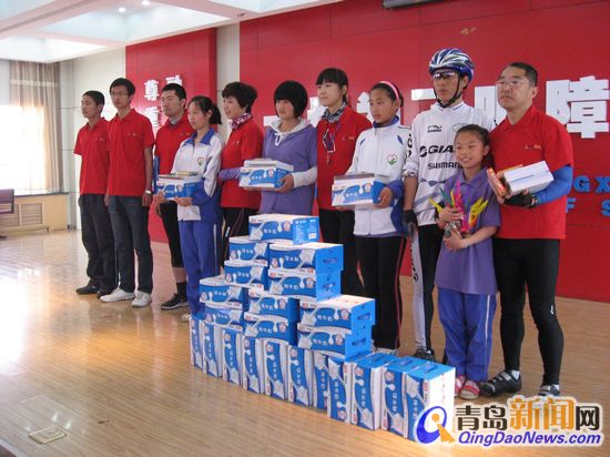 車行一小時,愛心騎行車隊(duì)來到本次公益活動的目的地青島市中心聾校,這里的老師與同學(xué)們早早佩戴好鮮艷的綬帶,站在整潔的校園內(nèi)等待著愛心人士們的到來。全隊(duì)上下首先隨校方來到會議室與學(xué)生們傾情互動,騎行網(wǎng)友送上了包括牛奶、記事本及其他活動用品在內(nèi)的愛心禮物,網(wǎng)友代表上臺發(fā)言,將他們匯集的希望與真情獻(xiàn)給了這里的孩子們。愛心企業(yè)青島光明乳業(yè)也贊助了幾十箱愛心牛奶,送到了孩子們的手中。