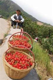 ????走進(jìn)櫻桃園,漫山遍野都是采摘櫻桃的游客,有的一棵樹(shù)前圍了七八個(gè)人?!敖裉爝M(jìn)園的游客很多,僅采摘這塊收入就很可觀?!痹谏缴患覚烟覉@入口處,果農(nóng)孫先生坐在地頭樂(lè)得合不攏嘴。當(dāng)天,孫先生的櫻桃園迎來(lái)了100多名游客,按照每人30元的采摘價(jià),僅這一項(xiàng)一天就收入3000多元。此外,游客臨走時(shí)還要買(mǎi)走一些櫻桃,一天能賣(mài)掉100多斤,按照每斤均價(jià)16元計(jì)算,就得近2000元,這兩項(xiàng)加起來(lái),他一天能收入5000元。