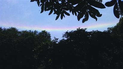 ????昨天,嶗山風(fēng)景區(qū)北九水景區(qū)晴空萬里,在北九水景區(qū)換乘中心東南方向的天空,出現(xiàn)了一道淡淡的彩虹,不少游客舉起相機拍攝。這道橫跨在北九水整個東南方向的彩虹,出現(xiàn)在昨天上午10時40分,起初一直倒掛在天際,直到中午11時30分,彩虹開始慢慢變直變淺,12點整彩虹才徹底消失在人們的視野里,前后持續(xù)1小時20分鐘。