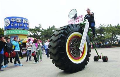 ????“棧橋附近有人在展示一輛超大的自行車,那個前輪比我的個子還高呢!”昨天下午,在棧橋附近游覽的游客和市民都被棧橋廣場西側(cè)一輛巨大的自行車吸引。記者聞訊趕到棧橋西側(cè)的觀景廣場,兩名中年男子正輪流駕駛一輛超大型的自行車向過往的市民和游客展示。