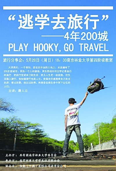 五(該專業(yè)五年制)學(xué)生。大學(xué)期間走過(guò)了200多個(gè)城市,留下了10萬(wàn)多張照片。2012年3月29日,唐人立“逃學(xué)去旅行———4年200城”個(gè)人影展在北京798eyecoffee開(kāi)幕,受到廣泛關(guān)注。今天,他的“逃學(xué)去旅行”校園巡講第三站來(lái)到他的家鄉(xiāng)南京林業(yè)大學(xué)。他說(shuō)這次畢業(yè)前的校園巡講,是對(duì)自己大學(xué)四年旅程的一份紀(jì)念,同時(shí)也是今年送給自己的畢業(yè)禮物。