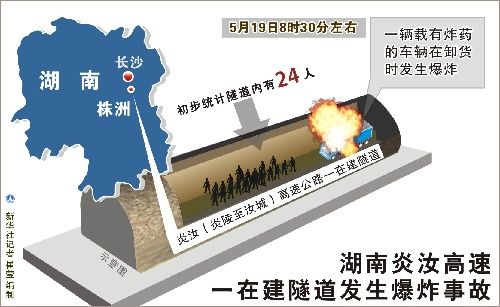 根據(jù)通知,5月19日8時(shí)30分左右,湖南省株洲市炎陵縣境內(nèi)中鐵三局集團(tuán)第五工程有限公司承建的炎汝(炎陵至汝城)高速公路第十三合同段,一輛運(yùn)送炸藥和雷管的低速載貨汽車,在八面山隧道內(nèi)發(fā)生爆炸,造成20人死亡、2人受傷。