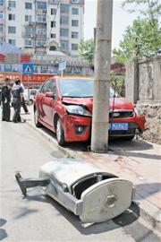 ????記者聞訊趕到事發(fā)現(xiàn)場,只見一輛車尾貼著“新手”標(biāo)貼的紅色福特??怂罐I車車頭頂在路邊的電線桿上,電線桿東側(cè)馬路上有一個被撞壞的鐵質(zhì)垃圾桶,轎車車頭明顯凹陷,車蓋遭撞擊已鼓起,車頭保險杠也被撞掉一大塊,固定電線桿的牽引線被撞斷。駕駛室內(nèi)的兩個安全氣囊全部打開,在車頭前空地上有油跡和水跡,可見機(jī)油箱和水箱均受損。