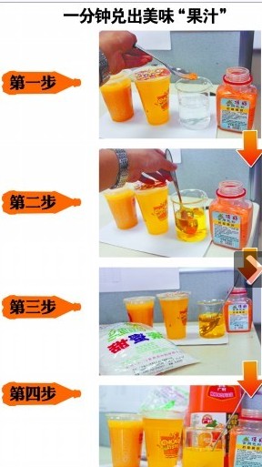 記者將買來的一杯鮮榨果汁、一杯配制果汁和一個盛了半杯涼白開水的燒杯放在一起。用勺子將小半勺的檸檬黃粉末加入白開水。充分攪拌后,白開水迅速變成黃色。幾次調(diào)整用量后,得到了與購買到的"濃縮液"兌出的橙汁十分相似的顏色,甚至更為鮮亮。將檸檬酸、甜蜜素先后加入燒杯中,這杯黃色的液體很快變得又酸又甜,幾次調(diào)整用量后,在酸度和甜度上,這杯黃色液體也與購買的兌出的橙
