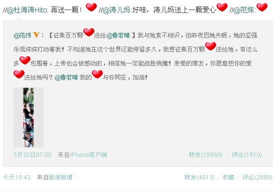 為了幫她圓夢(mèng),諸如“急診科女超人于鶯”、韓紅等名人紛紛發(fā)了微博給魯若晴加油鼓勵(lì),“急診科女超人于鶯”還專門為魯若晴撰寫了感人長(zhǎng)文。昨天是520“表白日”,微博賬號(hào)“作業(yè)本”甚至發(fā)起了“說一句’姑娘我愛你"活動(dòng),“她在這個(gè)世上的時(shí)間也許不多了,不需捐款,不需憐憫,到她的微博,跟她說一句,“姑娘我愛你”吧!讓她知道,活著很美! ”很快,“魯若晴我們愛你,加油!”的微博愛心“表白”接力便迅速在網(wǎng)友中傳開,而魯若晴也成為“表白日”最幸福的姑娘。