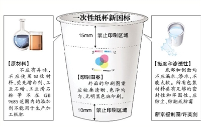 ????6月1日起,由國家質(zhì)檢總局和國家標(biāo)準(zhǔn)委發(fā)布的紙杯國家標(biāo)準(zhǔn)將正式實(shí)施。標(biāo)準(zhǔn)首次提出,紙杯“杯口距杯身15mm內(nèi)、杯底距杯身10mm內(nèi)”不應(yīng)有印刷圖案,不得使用回收原材料制作紙杯。
