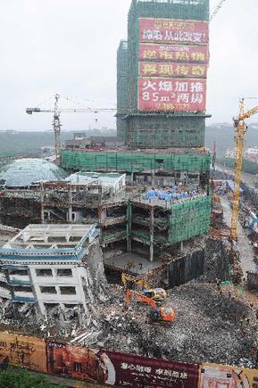 5月21日,工程機(jī)械在拆除綿陽紫荊民族中學(xué)校舍,旁邊則是建設(shè)中的萬達(dá)廣場。