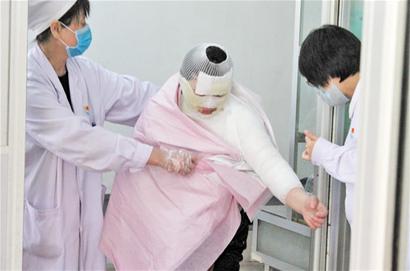 ????記者接到線索后趕到青島君良燒傷醫(yī)院時(shí),醫(yī)護(hù)人員正在為林某包扎燙傷的傷口,只見她的雙臂、胸前都被纏上了厚厚的紗布,額頭和臉頰也被紗布包裹,戴著網(wǎng)狀固定套的她對于自己遭遇的意外很傷心。