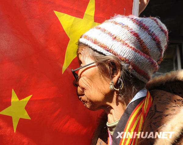 資料圖片:2009年4月5日,老阿媽次仁曲珍虔誠(chéng)地與天安門國(guó)旗護(hù)衛(wèi)隊(duì)贈(zèng)送的國(guó)旗碰頭。