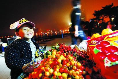 ????天暖了,但夜晚的海邊還是有點涼。昨晚6時,西陵峽路的夜市上,游人稀稀落落,攤販的數(shù)量甚至多過游人。郭淑霞像往常一樣,推著一輛4米多長、裝滿水果的兩輪車,從北京路的出租屋內(nèi)走到棧橋擺攤。車上還坐著一個小孩,那是她的小兒子許良梁,今年才5歲。到了夜市,郭淑霞開始向游客和市民推銷水果,5歲的良梁就站在媽媽身邊,小家伙眼睛滾圓,長得很精神,看到媽媽顧不上照顧他,他就自己溜到旁邊的一個賣裝飾品的攤位玩。攤主李先生說:“這孩子真讓人省心,也懂事,從不惹禍,我們附近的小商戶都喜歡他,他是我們的開心果。 ”過了一會,良梁看媽媽有些累了,就跑回媽媽的水果車旁,像個大人一樣幫媽媽賣起水果。這時過來一名游客想要香蕉,良梁拿起一串扯著嗓門喊:“這是香蕉,阿姨要多少? ”這小大人的模樣逗得攤販和游客笑成一團。