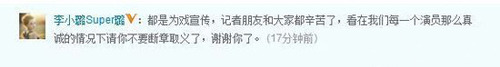 然而沒想到在微博上隨便的一句牢騷,卻被李小璐看見并開始和該記者理論起來,“鬧騰?我愿意談?在人性和道德上我相信我問心無愧。我不需要可憐兮兮的為您所謂的通稿而低頭,三歲拍戲到現(xiàn)在為的是我有信仰的家庭和觀眾以及善良懂事理的記者。but,I still feel grateful.Thanks a lot.”